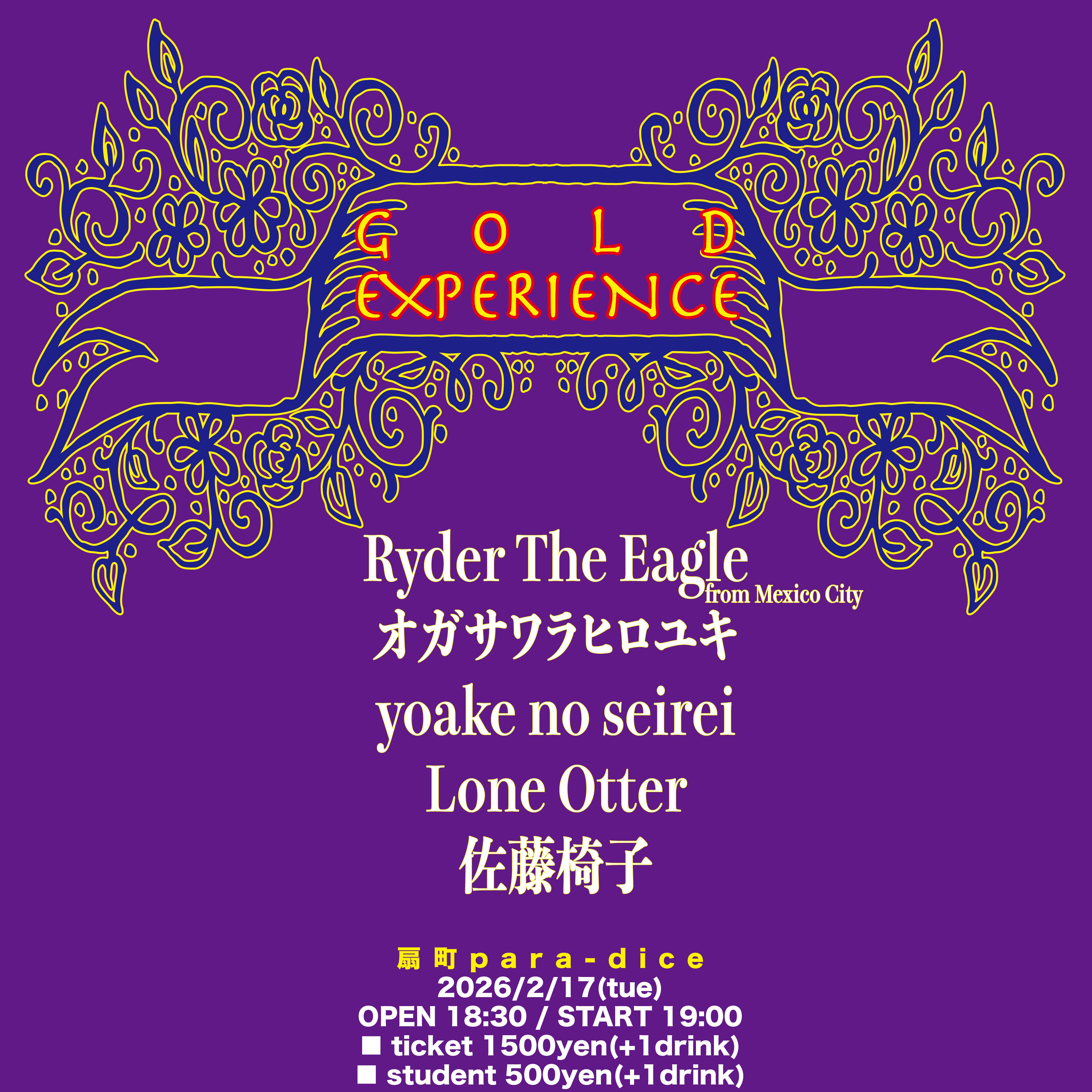 2026.02.17(火)[大阪]扇町para-dice para-dice presents “GOLD EXPERIENCE” 開場 18:30/開演 19:00 前売 1,500yen/当日 1,500yen w/佐藤椅子, Lone Otter, yoake no seirei, Ryder The Eagle(from Mexico City)